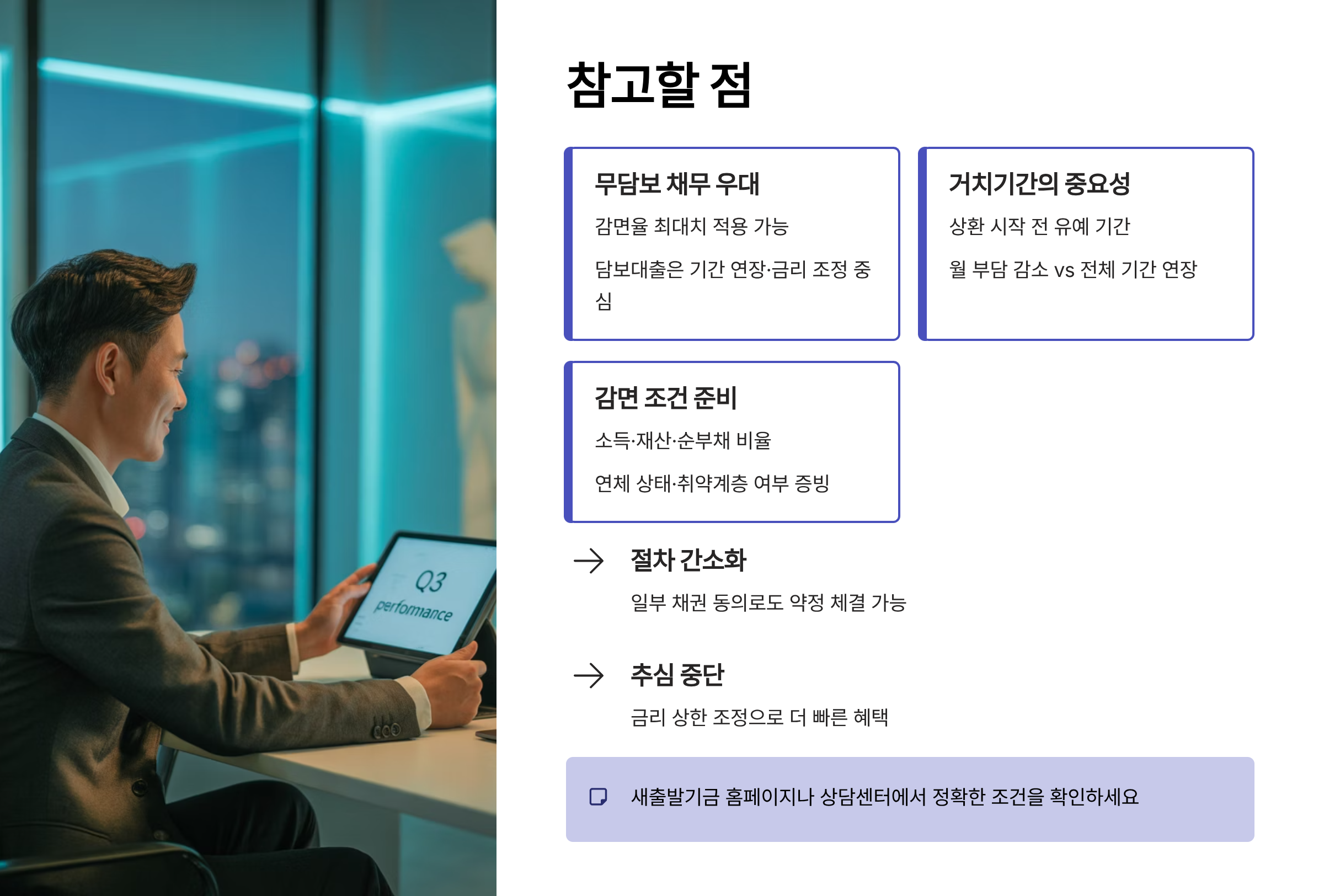 • “무담보 채무”가 감면율 최대치 적용 가능한 범위인 경우가 많고, 담보가 있는 대출은 감면보다는 상환기간 연장이나 금리 조정 쪽 혜택이 더 클 가능성이 있음.